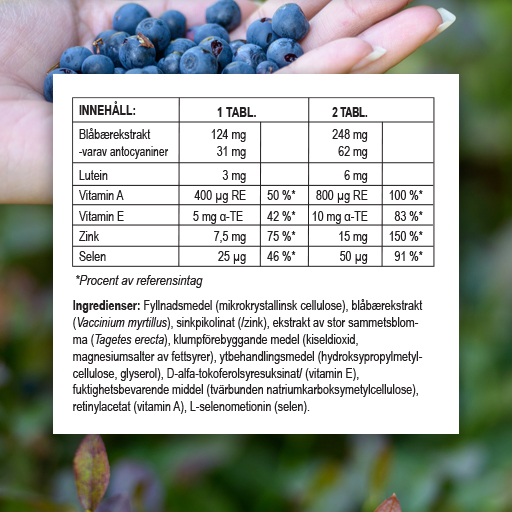 SE: Fyllnadsmedel (mikrokrystallinsk cellulose), blåbärsextrakt (Vaccinium myrtillius), sinkpikolinat (zink), ekstrakt av stor sammetsblomma (Tagetes erecta), klumpförebyggande medel (kiseldioxid, magnesiumsalter av fettsyrer), ytbehandlingsmedel (hydroksypropylmetylcellulose, glyserol), D-alfa-tokoferol (vitamin E), fuktighetsbevarande medel (tvärbunden natriumkarboksymetylcellulose), retinylacetat (vitamin A), L-selenometionin (selen).