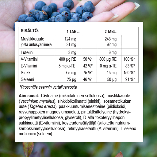 FI: Täyteaine (mikrokiteinen selluloosa), mustikkauute (Vaccinium myrtillius), sinkkipikolinaatti (sinkki), isosamettikukan uute (Tagetes erecta), paakkuuntumisenestoaine (piidioksidi, rasvahappojen magnesiumsuolat), pintakäsittelyaine (hydroksipropyylimetyyliselluloosa, glyseroli), D-alfa-tokoferoli (E-vitamiini), kosteudensäilyttäjä (silloitettu natriumkarboksimetyyliselluloosa), retinyyliasetaatti (A-vitamiini), L-selenometioniini (seleeni).