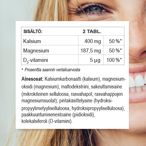 D-VITAMIINI – TÄRKEÄÄ LUUSTOLLE JA LIHAKSILLECal-Mag sisältää myös D-vitamiinia, joka edistää hyvinvointia monella tapaa. Luustolle D-vitamiini on tärkeä esimerkiksi siksi, että se edistää kalsiumin normaalia imeytymistä sekä luiden ja hampaiden pysymistä normaaleina. Lisäksi D-vitamiini edistää normaalin lihastoiminnan ylläpitämistä.