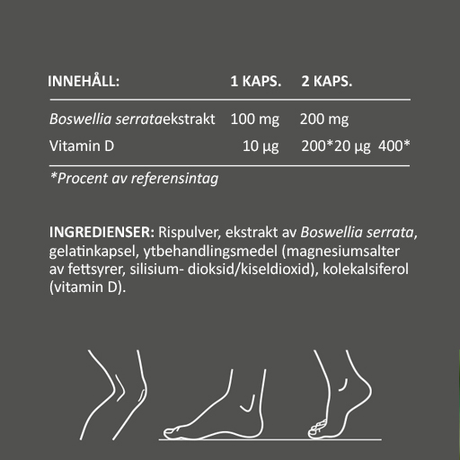 SE: Rispulver, ekstrakt av Boswellia serrata, gelatinkapsel, ytbehandlingsmedel (magnesiumsalter av fettsyror, kiseldioxid), kolekalsiferol (vitamin D).