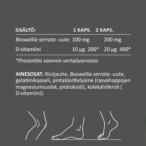 FI: Riisijauhe, Boswellia serrata -uute, gelatiinikapseli, pintakäsittelyaine (rasvahappojen magnesiumsuolat, piidioksidi), kolekalsiferoli (D-vitamiini).