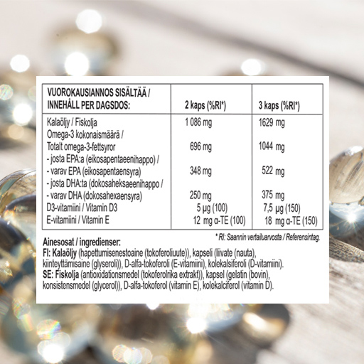SE: Fiskolja (antioxidationsmedel (tokoferolrika extrakt)), kapsel (gelatin (bovin), konsistensmedel (glycerol)), D-alfa-tokoferol (vitamin E), kolekalciferol (vitamin D).
